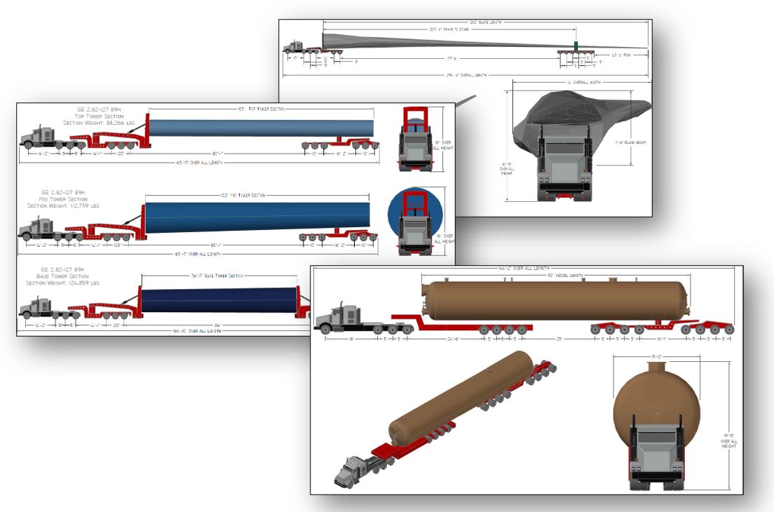 Transportation diagrams offer a visual representation of your truck, trailer and pay load before hitting the road. You can see exactly how your load will sit on a trailer, where the tie down points will be, and if you can make it under that bridge from your route survey.